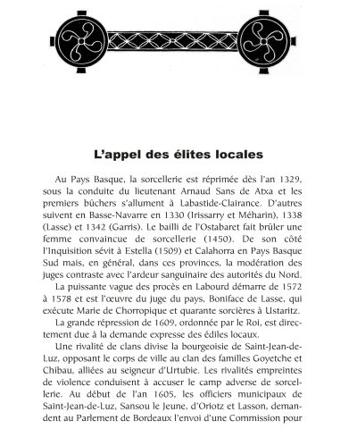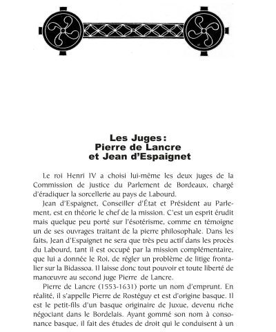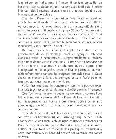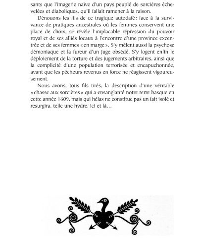En contrepoint, nous avons sélectionné quelques extraits de l’ouvrage de de Lancre, l’inquisiteur. Se dévoile un discours fantasmatique, lié aux obsessions de son auteur, mais aussi, sans doute, aux croyances de son temps. En filigrane, on peut y lire le Pays Basque du XVIIe siècle, ses coutumes, ses joies et son désarroi…
